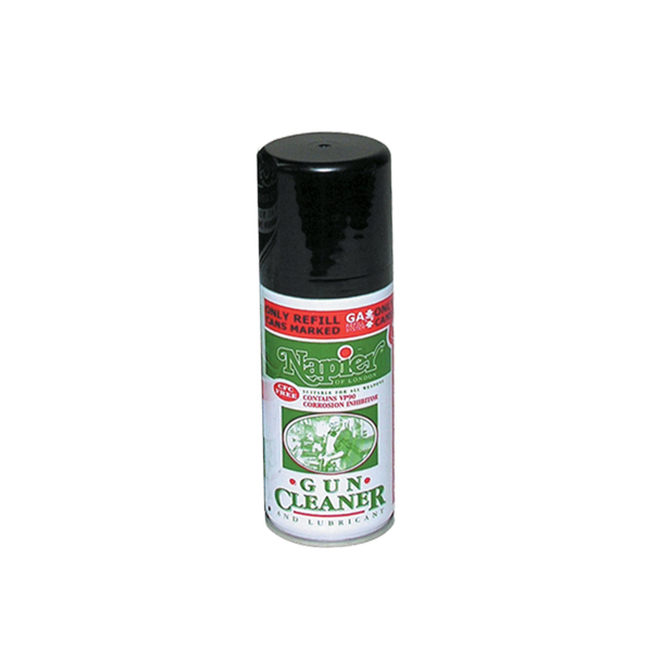 Το βραβευμένο καθαριστικό και λιπαντικό όπλου Gun Cleaner της Napier. Καθαρίζει και λιπαίνει συγχρόνως οποιοδήποτε τύπο όπλου. Αφαιρεί κατάλοιπα και καθαρίζει αποτελεσματικά χρησιμοποιώντας ασφαλείς διαλύτες αφήνοντας ταυτόχρονα μια λεπτή μεμβράνη λαδιού (VP 90) εξασφαλίζοντας διαρκή προστασία από διαβρώσεις. Δεν επηρεάζει ούτε διασπά το γράσο του όπλου και μπορεί να χρησιμοποιηθεί με ασφάλεια σε όλα τα πιστόλια και αεροβόλα όπλα. Αυτό το προϊόν έχει κατασκευαστεί ειδικά για τα όπλα και δεν καταστρέφει τα ξύλινα ή πλαστικά μέρη του όπλου.